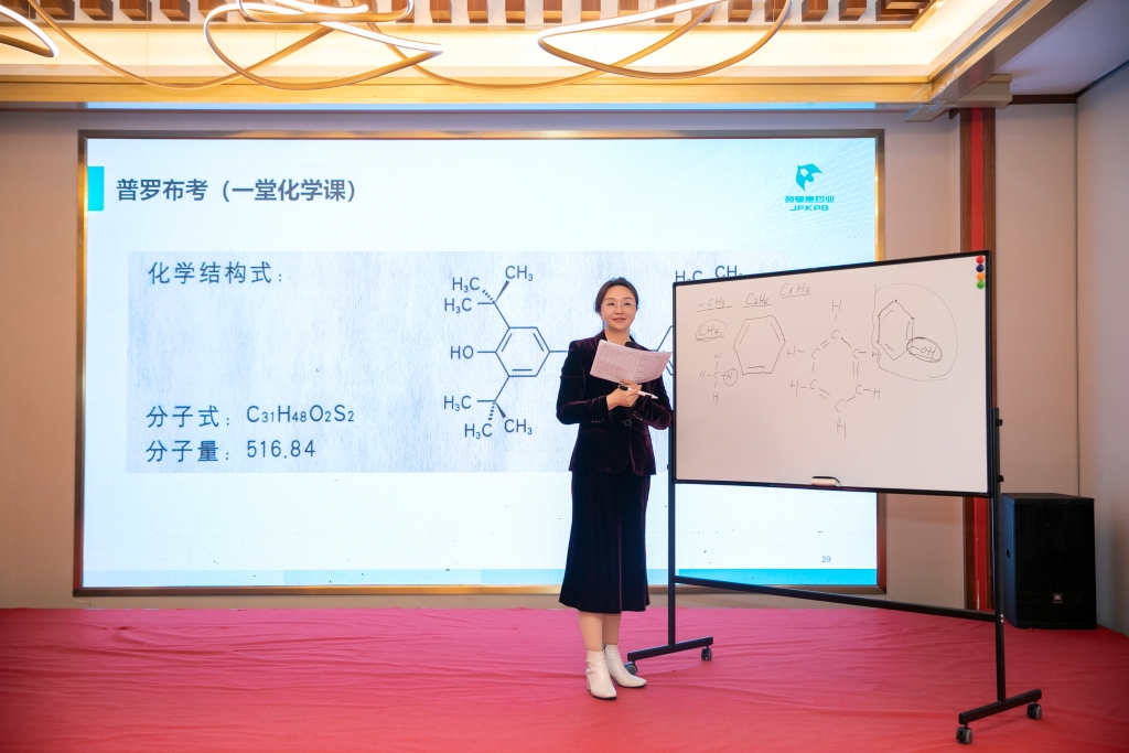 隨后總經(jīng)理王軼超通過一堂生動的化學(xué)課,向大家講解基礎(chǔ)有機(jī)化學(xué)知識,拆分普羅布考分子結(jié)構(gòu)式,增加大家對產(chǎn)品的了解。